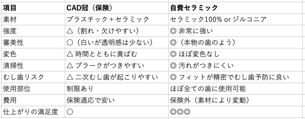 - 自費セラミックは「美しさ・強度・長持ち」を求める方向け